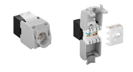 Keystone-RJ45 uttag som används i datauttag, patchpaneler mm. Datakabeln ansluts enkelt utan behov av specialverktyg. |